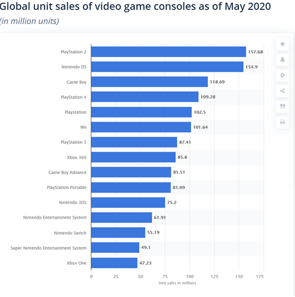 I say ‘appeared to’ because living in the UK or USA you’d have gotten that impression. Anecdotally, that’s what it looked like, and almost every developer targeted the Xbox 360 as the lead platform over the PlayStation 3 because that was where the sales were perceived to be (and also it was much less of a bastard to work with, architecturally speaking, but that’s a different article). But as the chart shows, global sales between the two were actually quite even. What’s interesting about that is that it shouldn’t have been the case, but Sony’s massive hubris coming off of the success of the PlayStation 2 led to them dropping the ball with the PlayStation 3, allowing Xbox to more than triple the sales of their previous generation entry, the Original Xbox. To be fair, XBox’s initial hubris/incompetence at the start of this generation played a significant role in Sony reclaiming their dominance. But from the looks of this thus (taking COVID-19 out of the equation) it doesn’t look as if PlayStation has any intention of repeating past mistakes and letting Xbox back into the lead in the upcoming generation – the ninth if you were wondering.